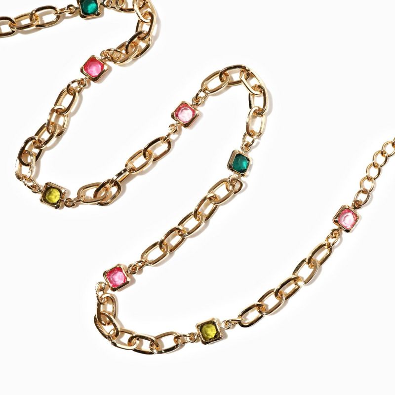 スクエアにカットされたカラーストーンと華奢なチェーンの組み合わせは