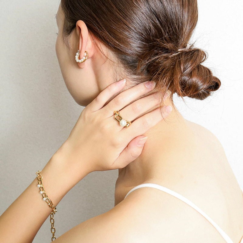 パールがさりげなく手元で主張してくれるので、シンプルなトップスの袖上からつけるのもおすすめです。