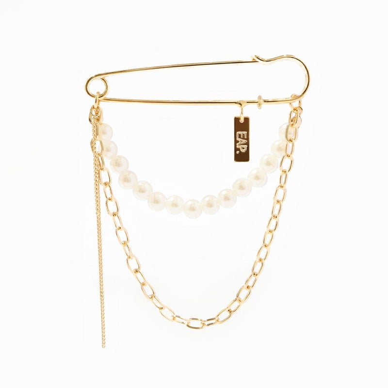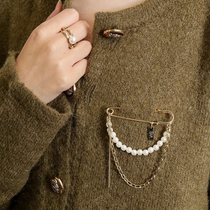 パールとチェーンをミックスしたデザインブローチ。揺れるデザインでゴージャスな印象をプラス。