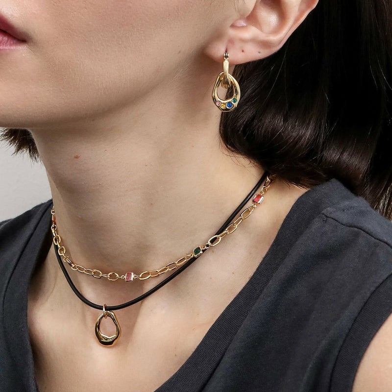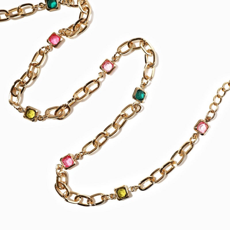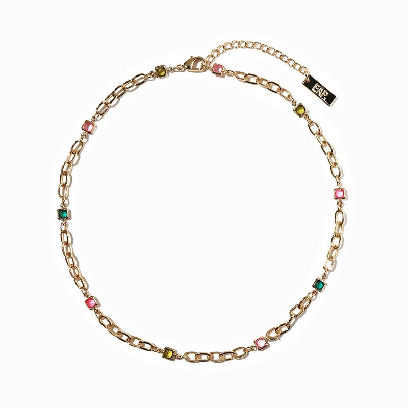 スクエアにカットされたカラーストーンと華奢なチェーンの組み合わせは
