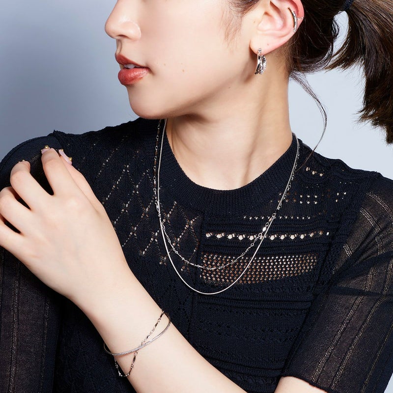 1本の表面には華奢なビジューをセッティングし動くたびにさりげなく輝くデザイン。